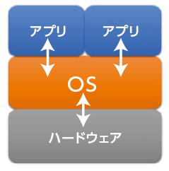 ハードウェアとアプリケーションとを仲立ちする役割をもち、ハードウェアの制御を行いながら、ハードウェアの機能を使うためのインターフェイスをアプリケーションに提供する。