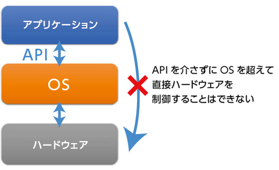 この仕組みによってハードウェアは抽象化されていて、OSというワンクッションを挟むことで、ハードウェア構成の違いをOSが吸収、アプリケーション側は同じAPIを使えば、常に同じ結果が得られるようになっています。
