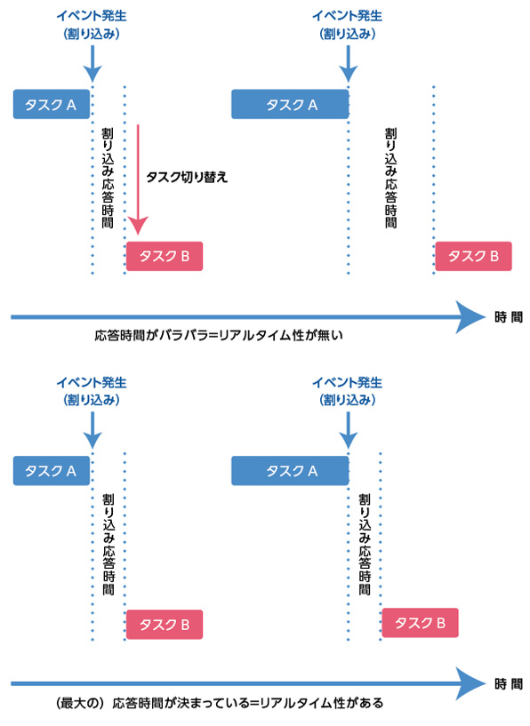 通常コンピュータは何十何百というタスクを並列実行(マルチタスク)しているのでリアルタイム性の確保は難しいとされています。リアルタイム性を確保するにはOS側の対応が必要で、そのような機能をもつOSをリアルタイムOS(RTOS)と言います。