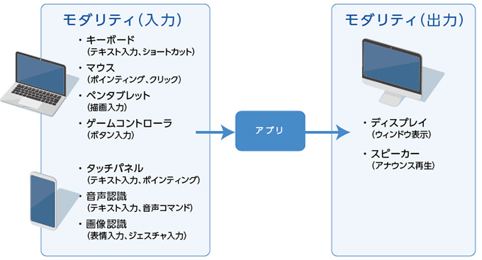 コンピュータを利用するにあたって、人間とコンピュータの架け橋となるのがユーザーインタフェースです。そのユーザーインタフェースを構築するためのさまざまな手法を、総じてモダリティと呼んでいます。