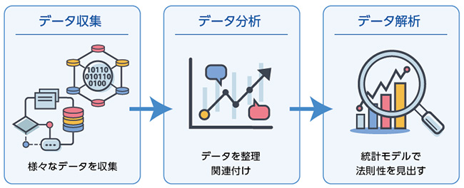 - 3 データ解析……分析の結果がなぜそうなったのか原因を究明する。