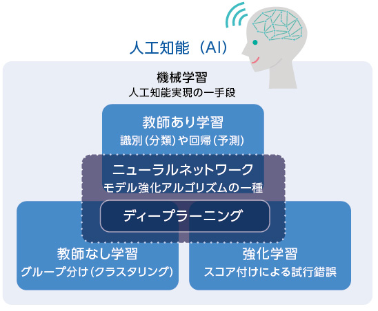 また、昨今ディープラーニングが高い注目を集めていますが、これはニューラルネットワークというアルゴリズムの一種で、先の3つの機械学習でモデル強化に用いられる強力なアルゴリズムの1つです。