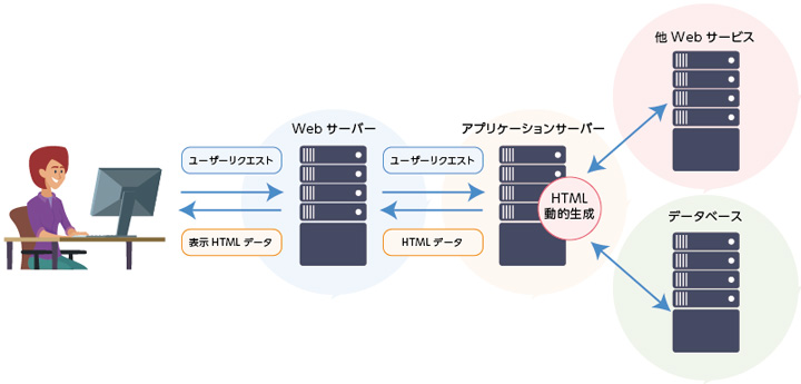 動的生成の大まかな仕組みとしては、Webサーバーの裏で稼働するアプリケーションサーバーが鍵を握ります。Webサーバー経由でユーザーのリクエストが届くと、アプリケーションサーバーはデータベースや他Webサービスとの連携で必要なパーツを集め、HTMLドキュメントを動的生成します。生成されたHTMLドキュメントは、Webサーバー経由でユーザーのWebブラウザに表示されます。