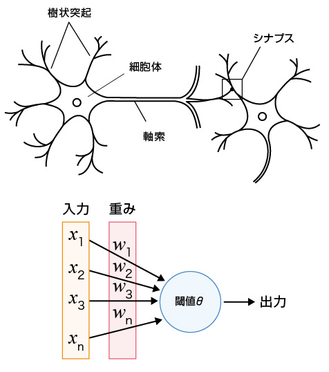 これをコンピュータ上で模したものが「パーセプトロン」と呼ばれるモデルです。パーセプトロンは、入力信号に対して重み付けを設定し、その総和が一定の閾値を超えるかどうかで、出力を変える(次のパーセプトロンの入力値を変化させる)単純な機構です。