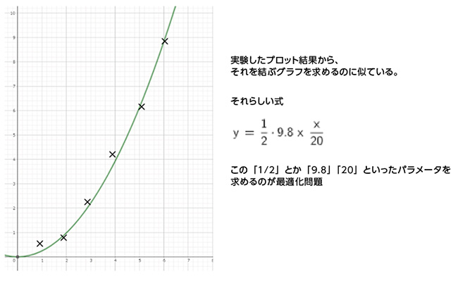 物理や化学の実験などで、実験値から、それに近いグラフを描くことがありますが、こうした近似的なグラフを求める処理と似たような処理(しかも次元が多くてとても複雑なもの)を、最適化の処理では行っていると考えるとわかりやすいでしょう。
