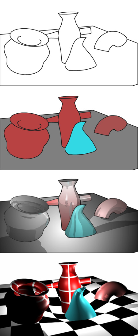 レンダリングでは、カメラの向きによって、全体から「絵」として見える範囲が切り抜かれます。その絵がどのような色合いになるのかは、光源から出る光を計算し、物体に当たったときにはその反射率に応じて反射させるなど、複雑な計算をして決めます。当然、ある物体の後ろにある物体は隠れますし、影も付きます。