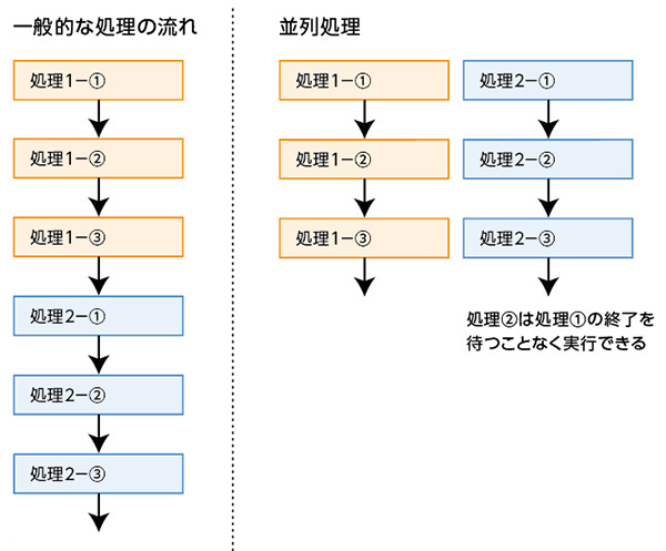 並列処理は、複数の処理を並行して同時に動かす仕組みです。それぞれの処理は、独立して動くことから「非同期処理」とも呼ばれます(「同期」とは、互いに相手の状態を確認しながら処理を進めることを言います)。