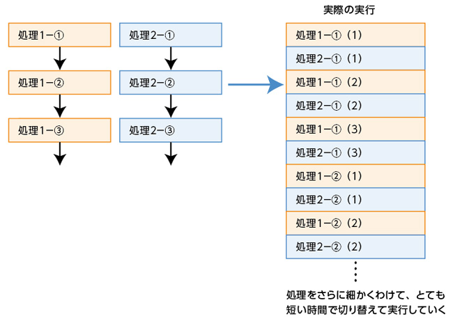 そのため実際には、並列処理は指定したとおりに同時に実行されるのではなく、OSなどのソフトウェアがもつ「タスクスケジュール」という機能によって、複数の処理を分割し、それぞれをとても短い時間で切り替えて実行することで、あたかも並列に実行されるようにする機構で実現されています。