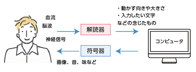 脳とコンピュータをつなぐ装置。脳波や神経信号、血流などを検出、分析することで、脳とコンピュータなどの機械との入出力を体の動きや感覚器を介さずに行えるようにしたもの。