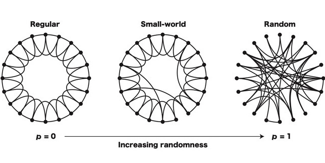 これについては下の図式を見てもらったほうがわかりやすいかもしれません。一つの円(ループ)の上に、点(ノード)をおいて点同士をつなぐ(リンクする)と、基本的には緊密に一定の間隔でつながっているものの、部分的に遠くの点ともつながる(ショートカット)、いわゆるイレギュラーなことも起きます。一定の規則でつながることを「秩序」と考え、遠くの点としかつながっていないをランダム、いわゆる「無秩序」とみなしたとき、その間の数値をパラメータで動かすと、ある箇所で、その「秩序」と「無秩序」が同居するところが現れます。それが「スモールワールド・ネットワーク」である、と2人は結論づけました。そしてこれが、あらゆる生き物の中にも存在することを突き止めたわけです。